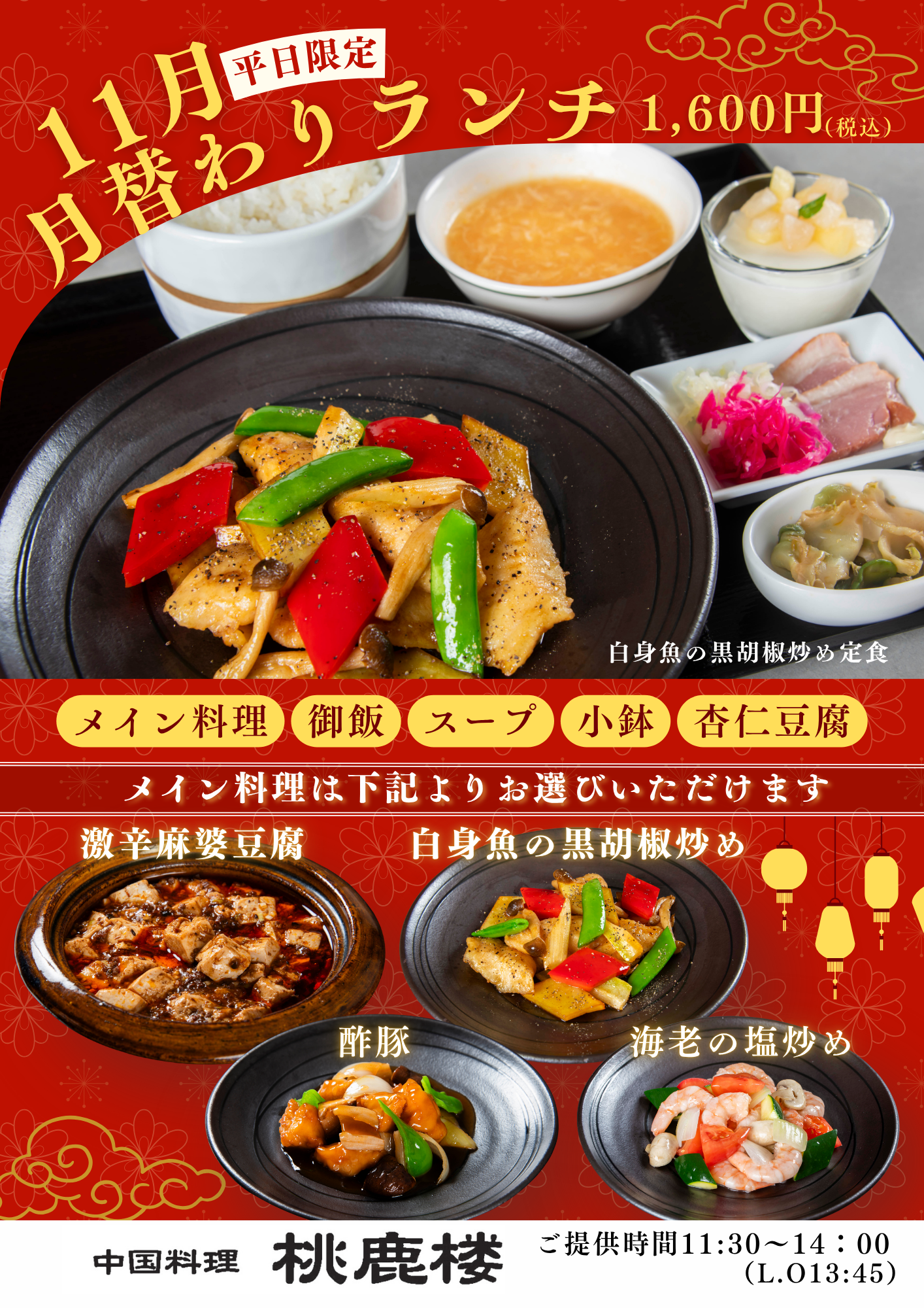 主菜・スープ・小鉢・ご飯・デザート/激辛麻婆豆腐又は月替わりの主菜をお楽しみいただけます。