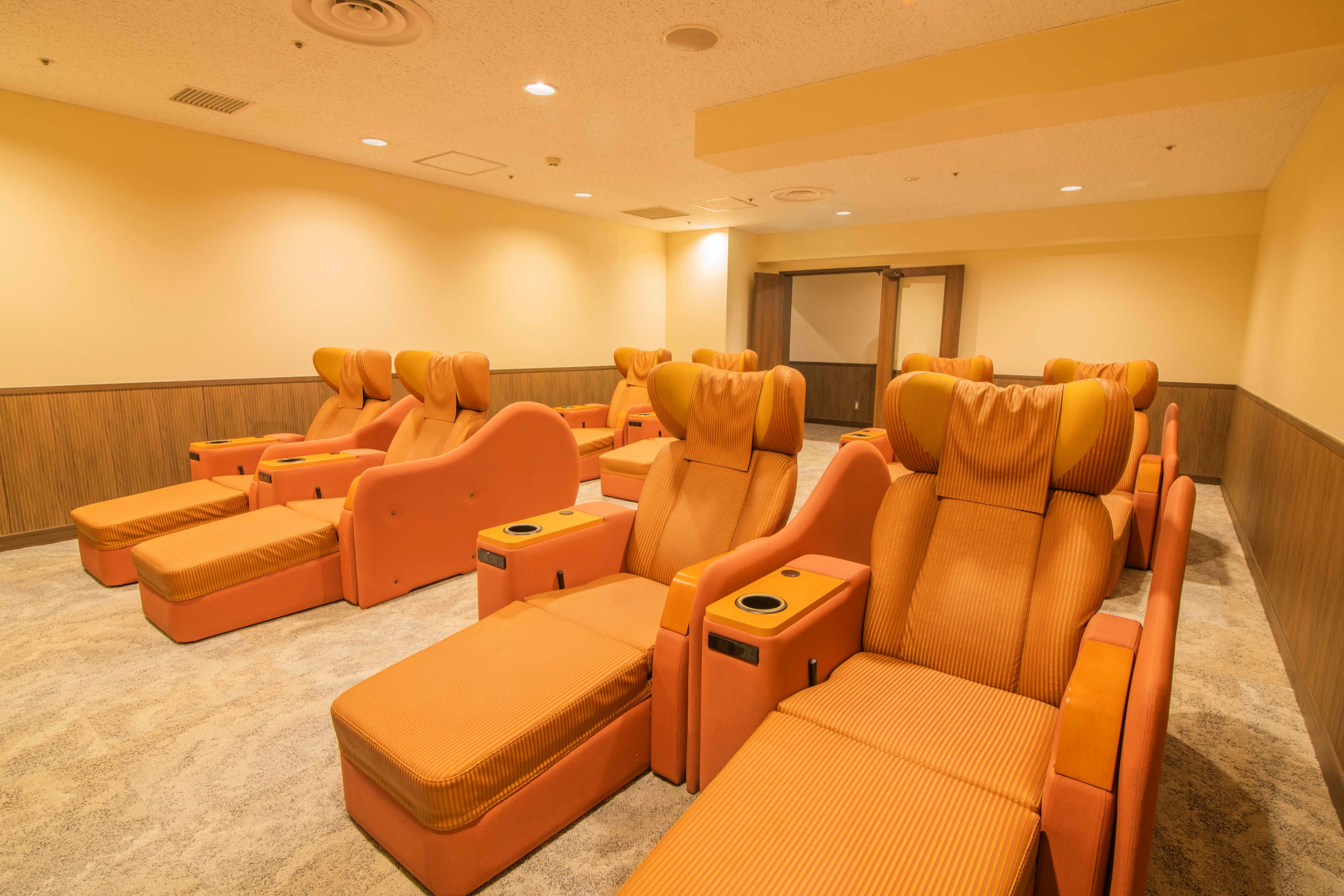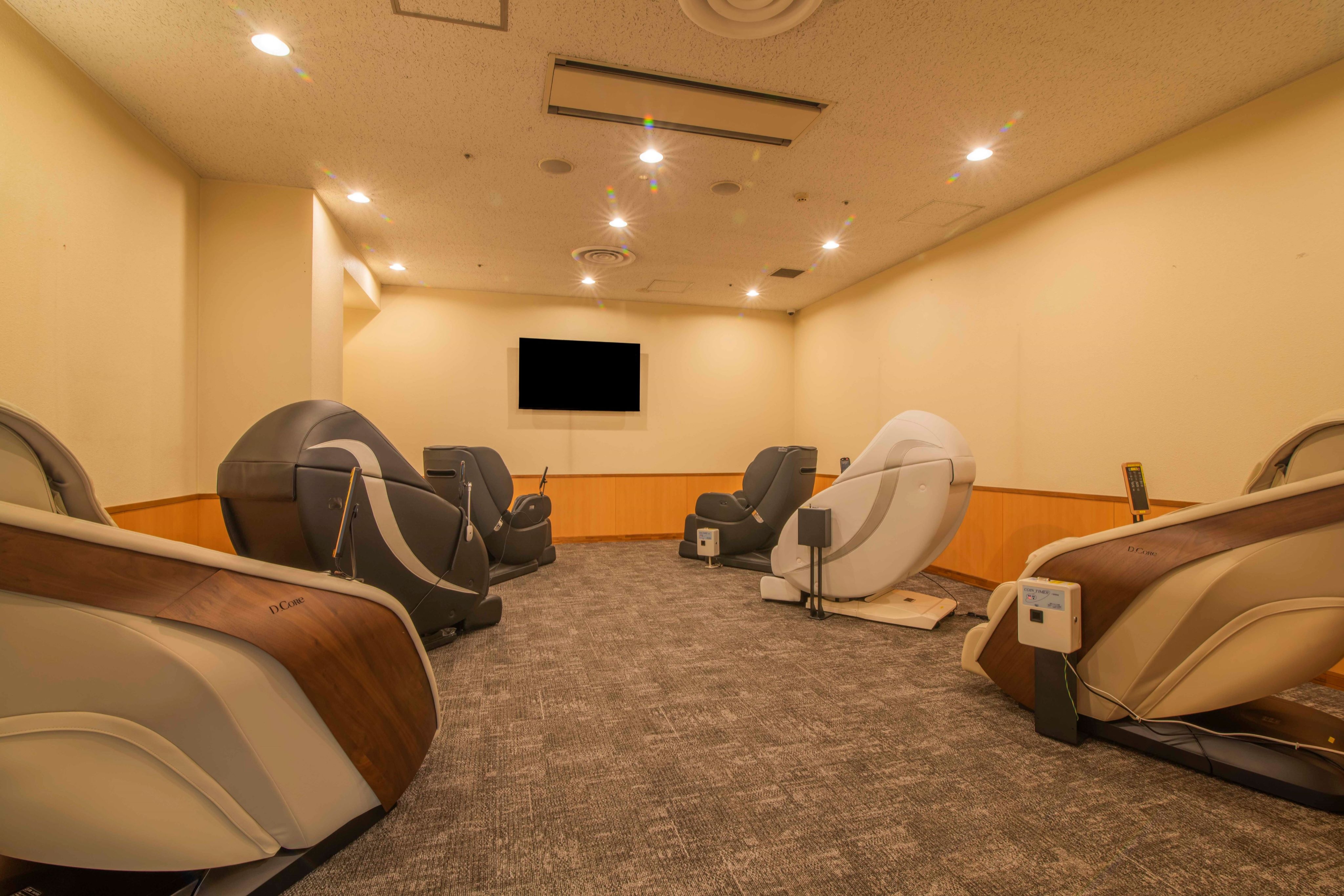 ゆったりと身体を預けられるマッサージチェアを備えた、静かに過ごせるくつろぎ空間です。足先から肩まわりまで心地よくほぐされながら、照明を落とした落ち着きのある空間で、思わずうとうとする至福のひとときをお楽しみください。