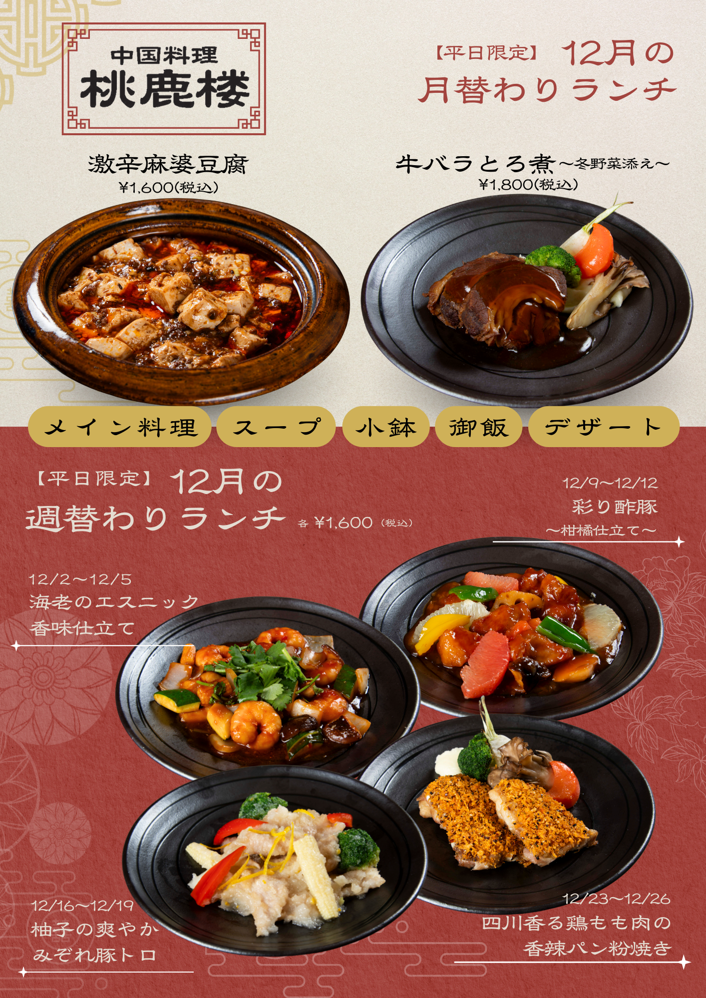 主菜・スープ・小鉢・ご飯・デザート/激辛麻婆豆腐又は月替わりの主菜をお楽しみいただけます。